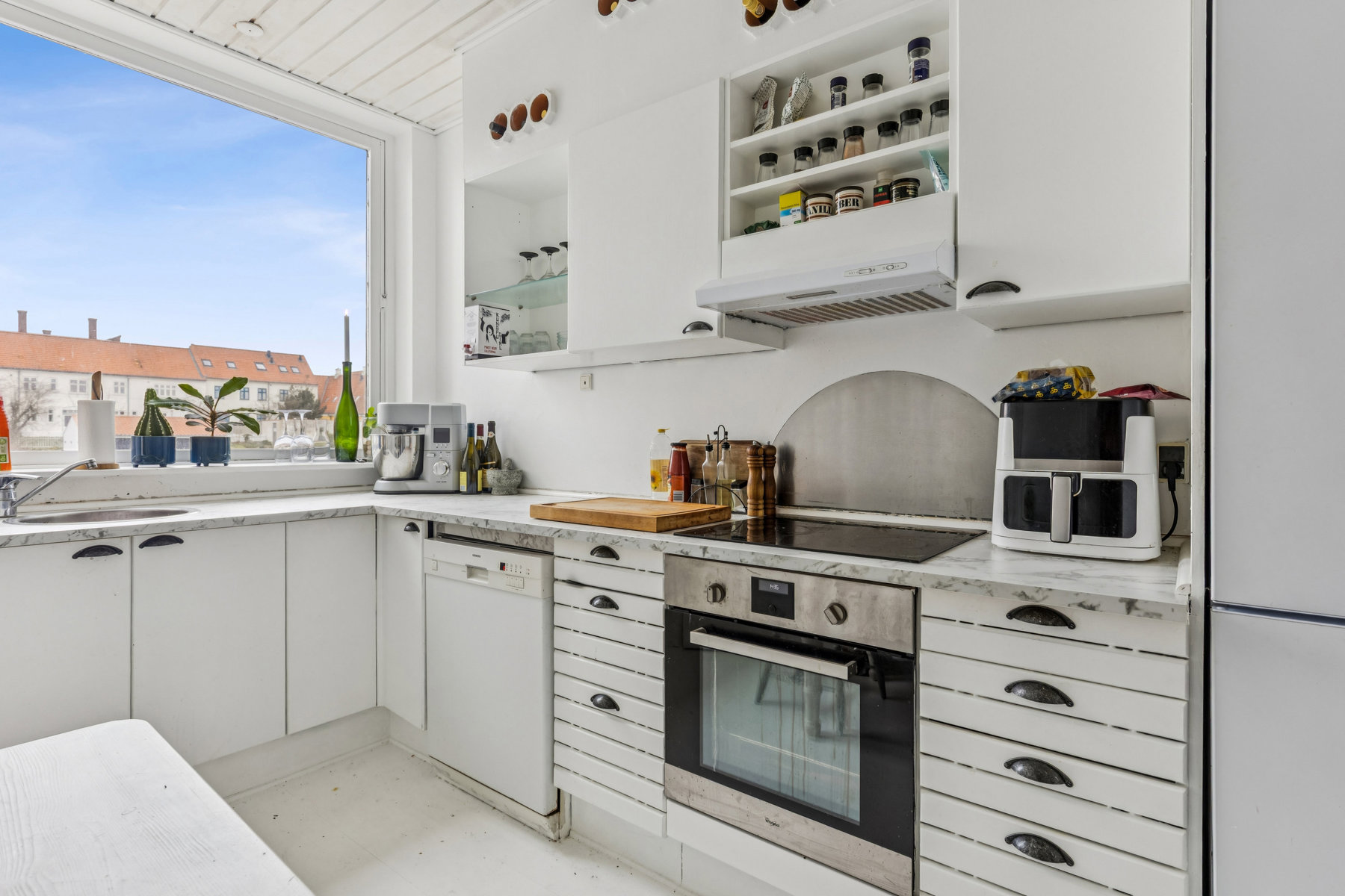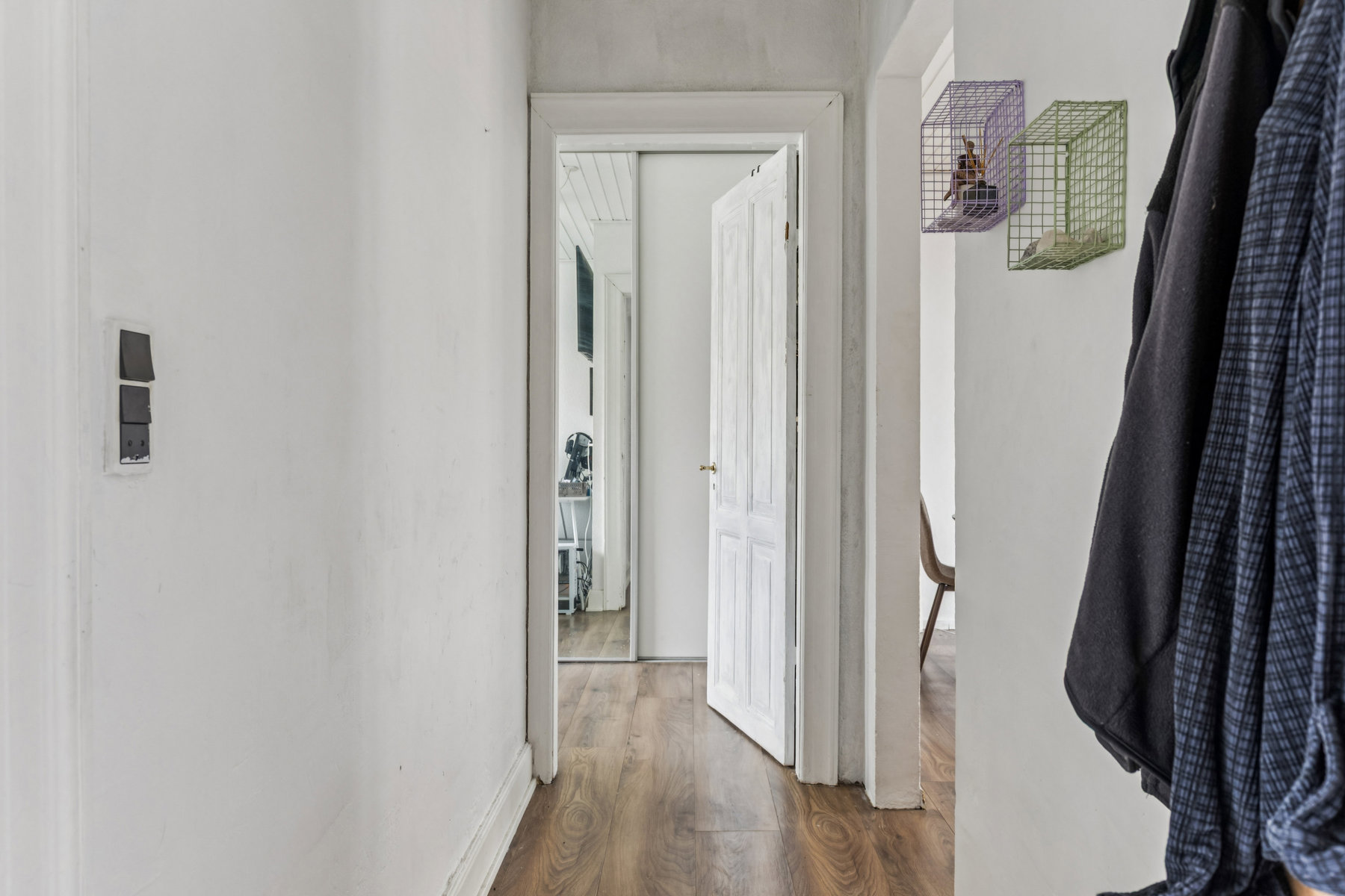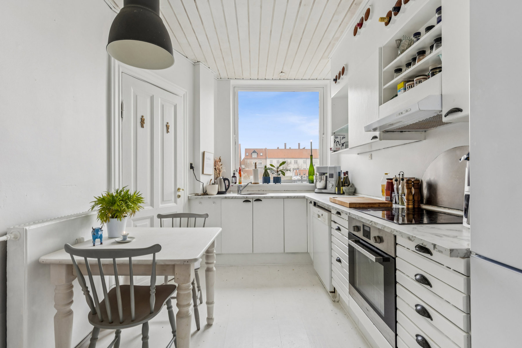Når du træder ind i lejligheden, bliver du mødt af en indbydende fordelingsgang, som skaber en behagelig forbindelse mellem boligens forskellige rum. Gangen leder først videre til et funktionelt køkken, der er udformet med fokus på både æstetik og praktisk anvendelighed. Her er der gode opbevaringsmuligheder, og køkkenet er velegnet til både simple måltider og mere omfattende kulinariske eventyr.