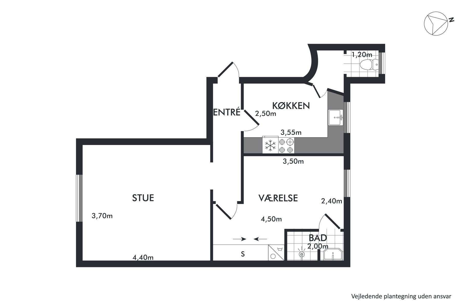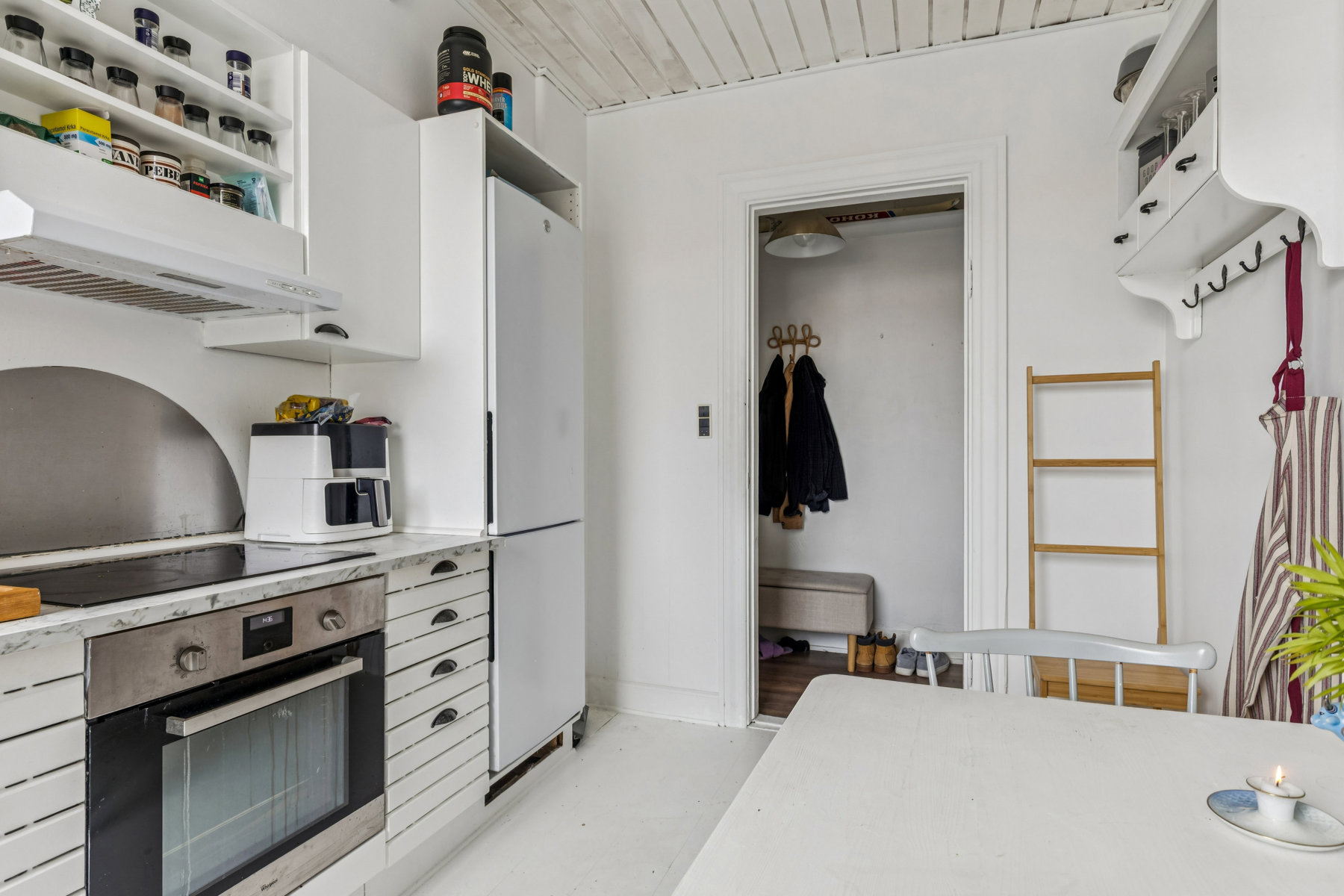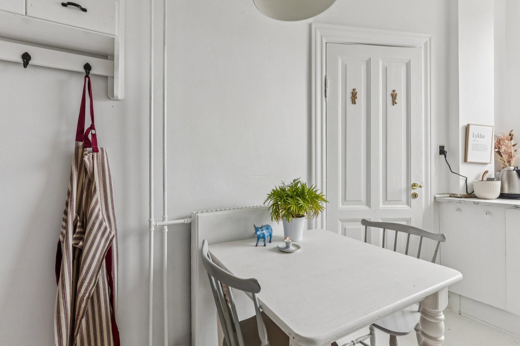 Når du træder ind i lejligheden, bliver du mødt af en indbydende fordelingsgang, som skaber en behagelig forbindelse mellem boligens forskellige rum. Gangen leder først videre til et funktionelt køkken, der er udformet med fokus på både æstetik og praktisk anvendelighed. Her er der gode opbevaringsmuligheder, og køkkenet er velegnet til både simple måltider og mere omfattende kulinariske eventyr.