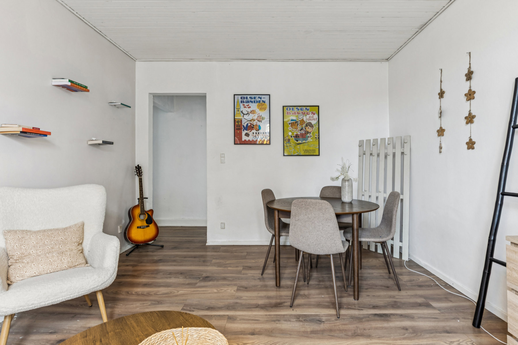 Lejlighedens stue er rummelig og lys, hvilket giver rig mulighed for at indrette et afslappet opholdsområde samt et hyggeligt spiseområde. Dette rum byder på en varm atmosfære, der skaber en afslappet ramme for både hverdag og samvær med venner og familie.