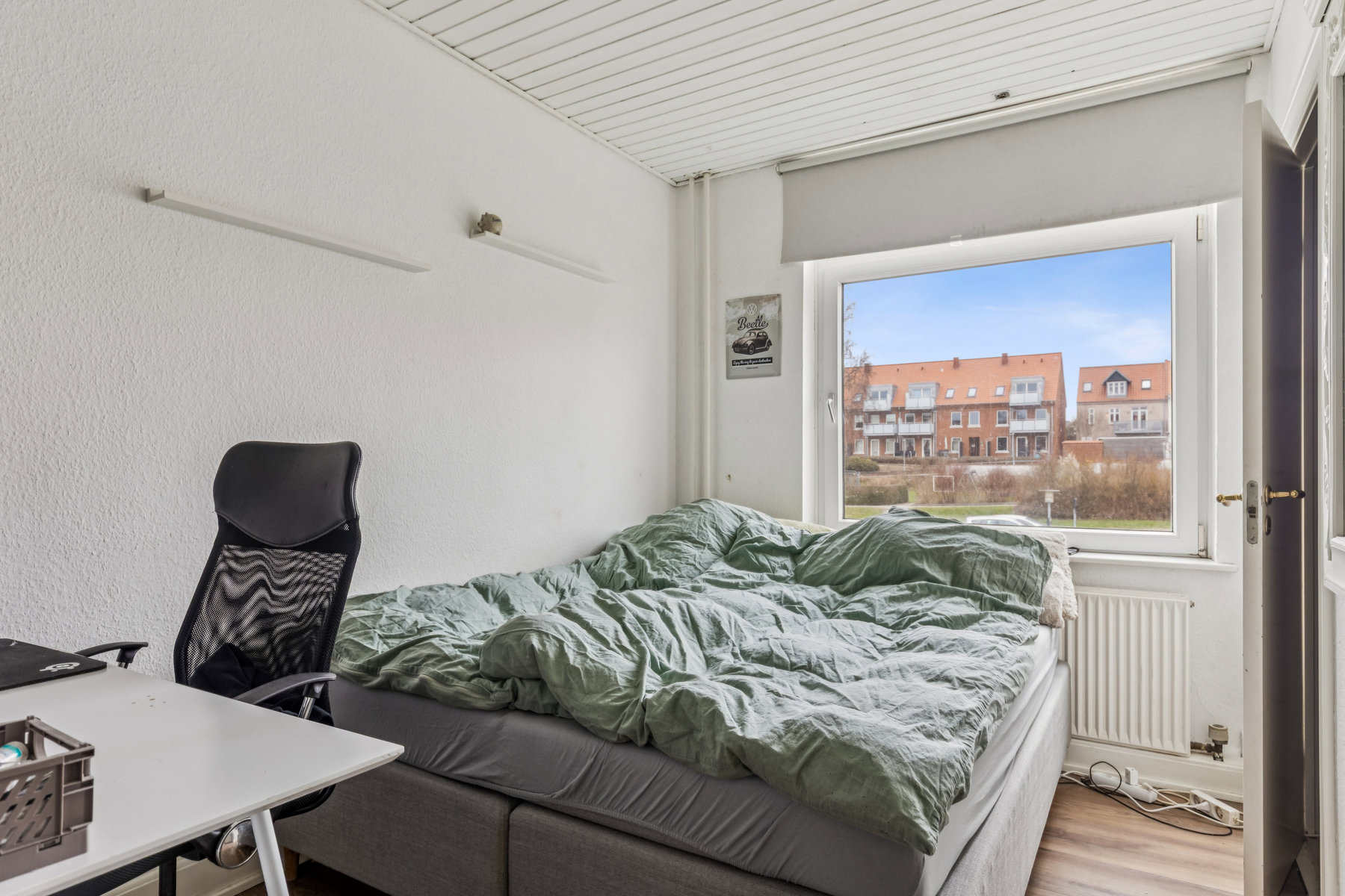 Soveværelset er placeret for enden af gangarealet og tilbyder et roligt fristed med en rummelighed, der nemt kan rumme en dobbeltseng og garderobeløsning. Soveværelset har direkte adgang til badeværelset, som er funktionelt indrettet.