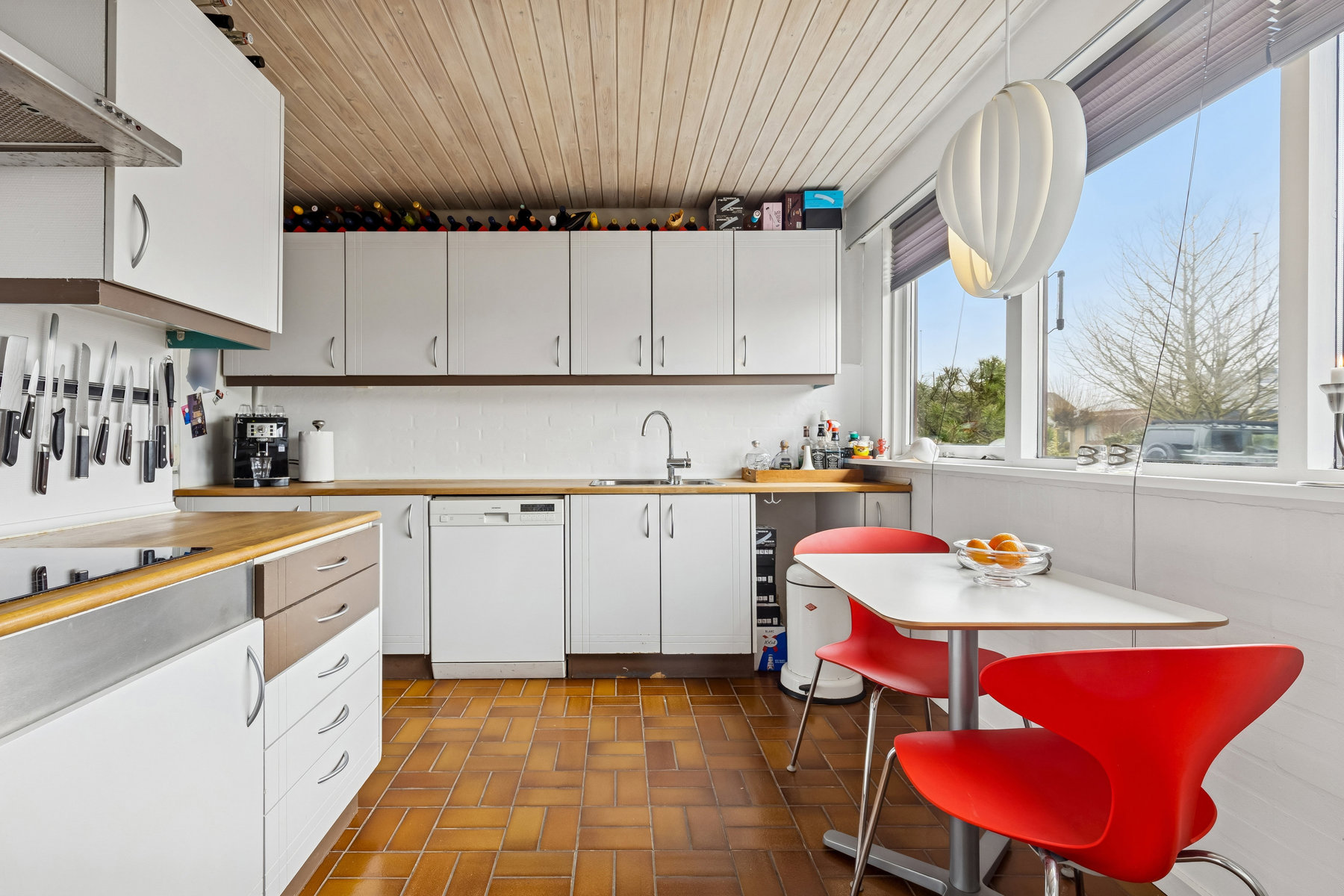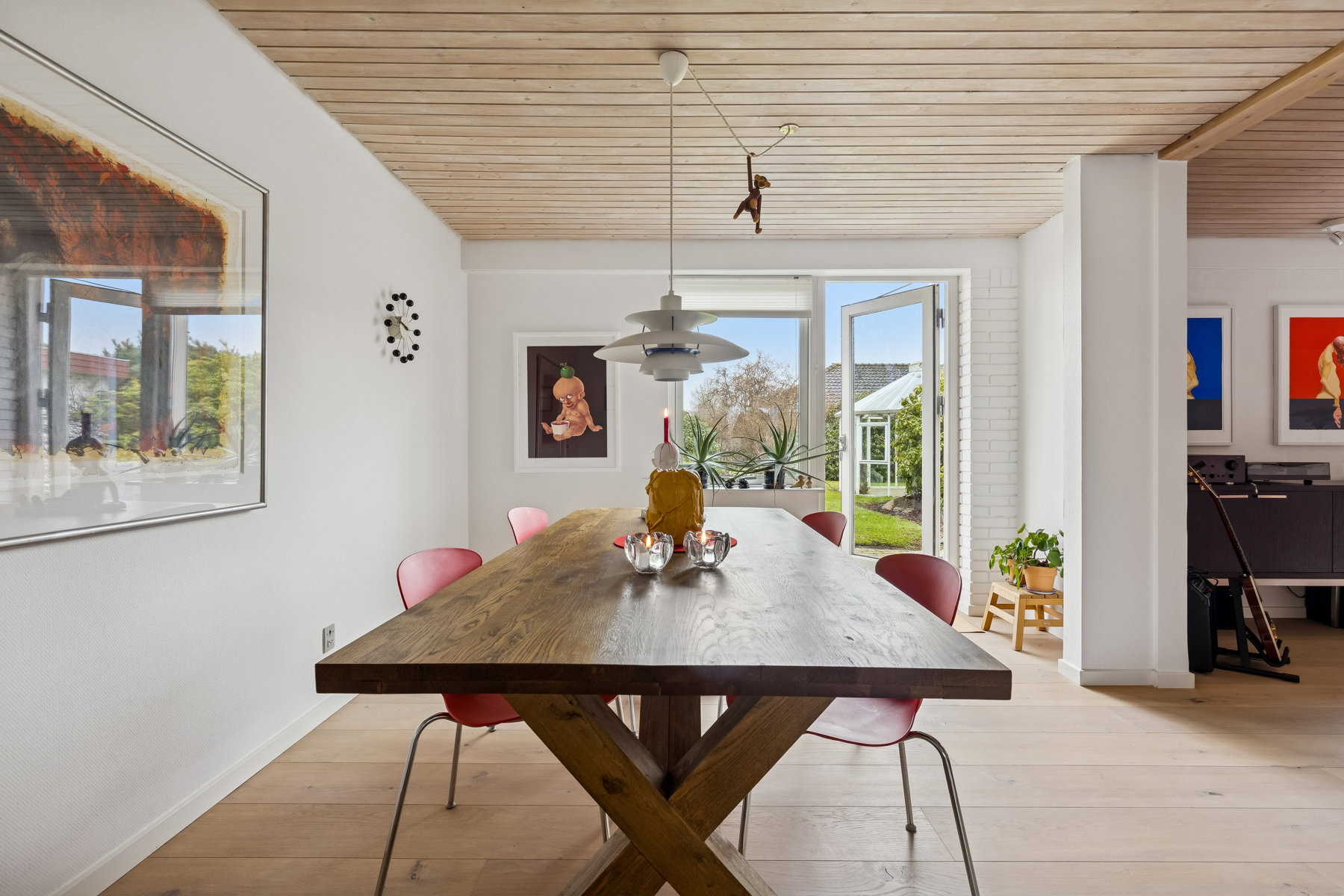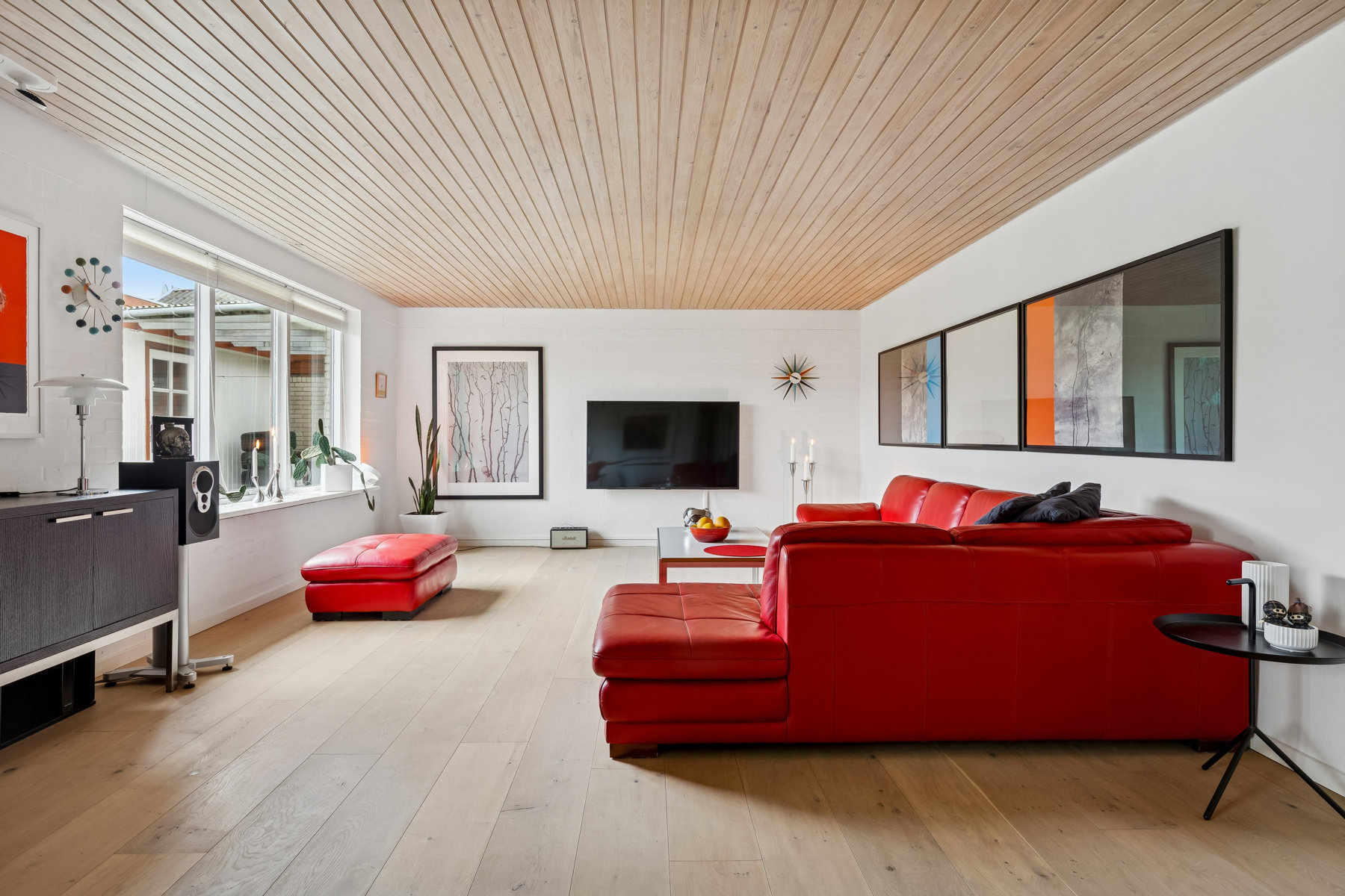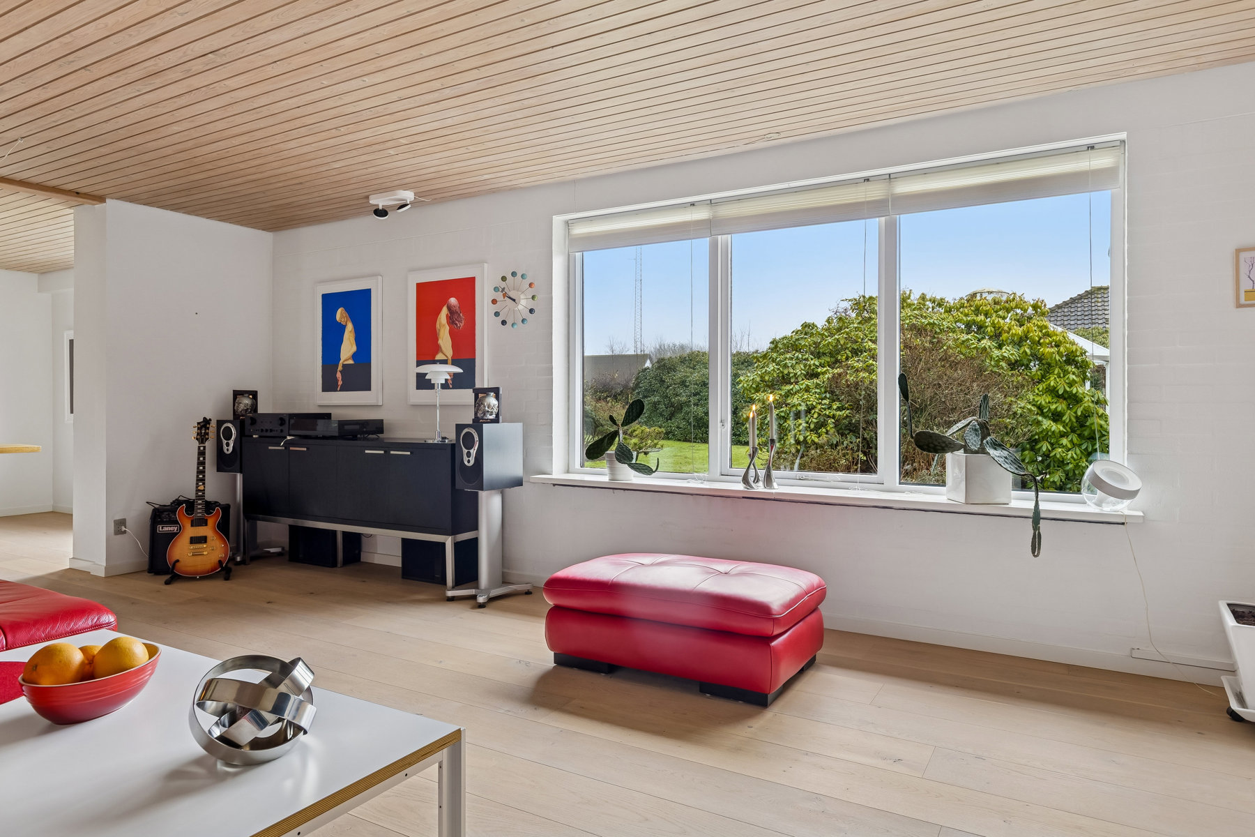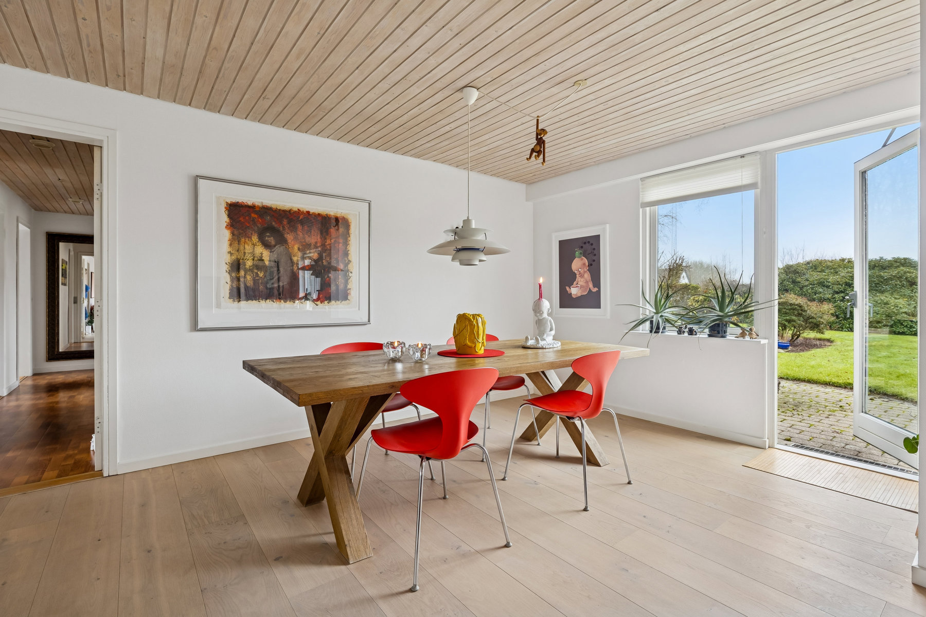 Stuen står som et centralt samlingspunkt med sin imponerende størrelse, der let kan rumme et hyggeligt sofaarrangement såvel som en plads til familiens spisebord. Her er der mulighed for at skabe et indbydende miljø for både dagligdags afslapning og festlige anledninger. Det store vinduesparti lader et behageligt lys strømme ind, hvilket skaber en lys og venlig atmosfære i rummet.