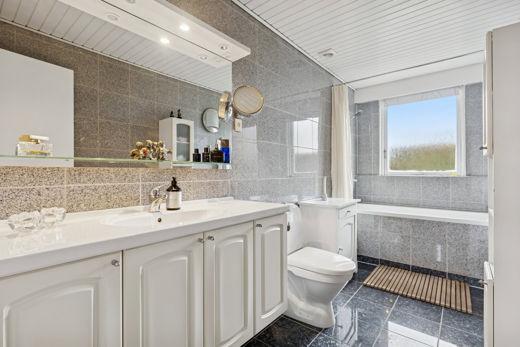 Badeværelset i boligen er af en anseelig størrelse, hvilket giver mulighed for at indrette det med al ønskelig komfort og funktionalitet. Her findes plads til både badekar med brus, hvilket giver boligen et praktisk og tidssvarende præg.